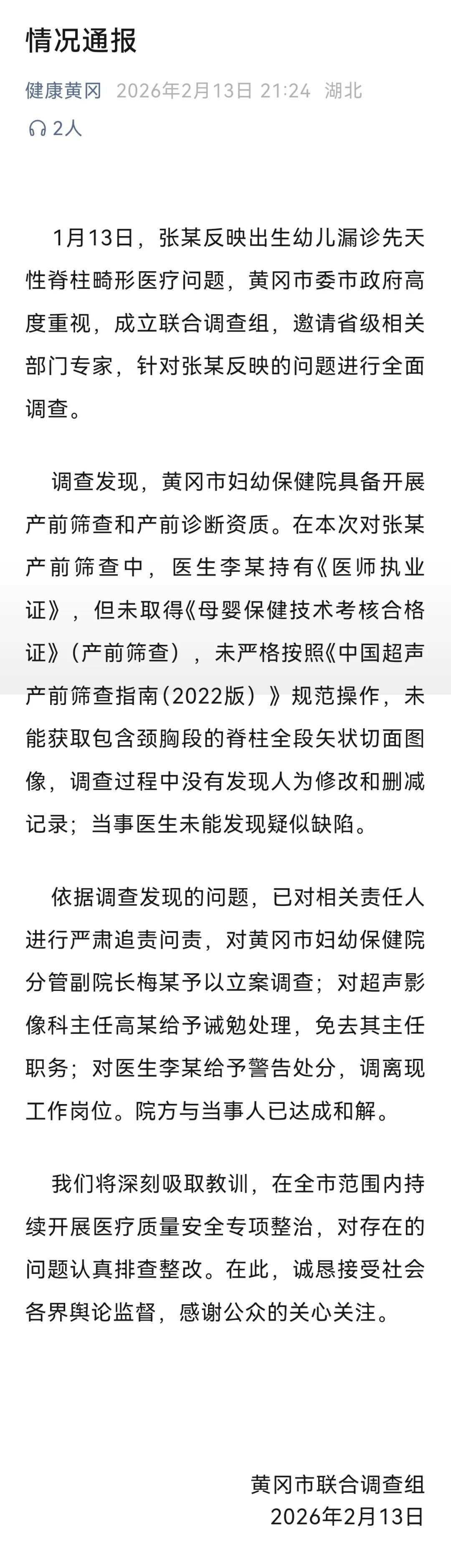 2月13日,湖北黄冈市联合调查组发布情况通报,全文如下:
