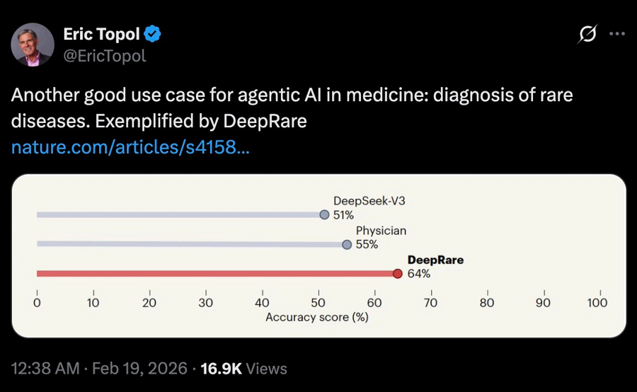 转化医学领域的领军人物、数字医疗泰斗、美国斯克里普斯研究转化研究所(Scripps Research)所长 Eric Topol 将 DeepRare 视作Agentic AI在医学领域的优秀范例。