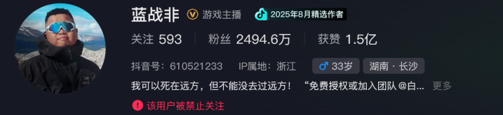 9月25日沪深投,千万粉丝博主蓝战非的抖音、小红书、B站等账号被禁止关注。截至目前沪深投,其抖音粉丝近2500万。